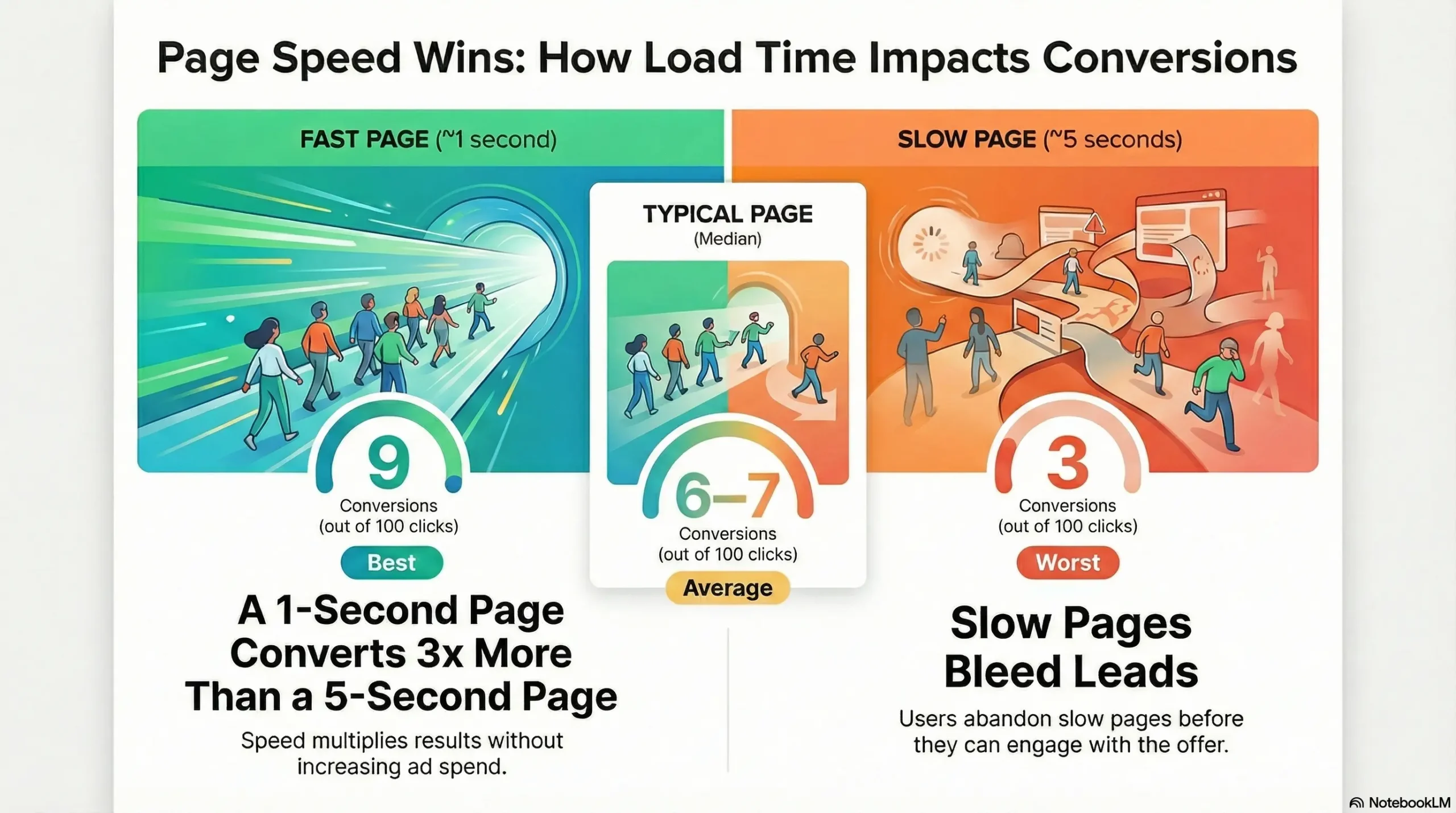 Fast page (~1 second) ~9 conversions (illustrative) If a 1-second page converts at 3x the rate of a 5-second page, you’re multiplying results without increasing ad spend.