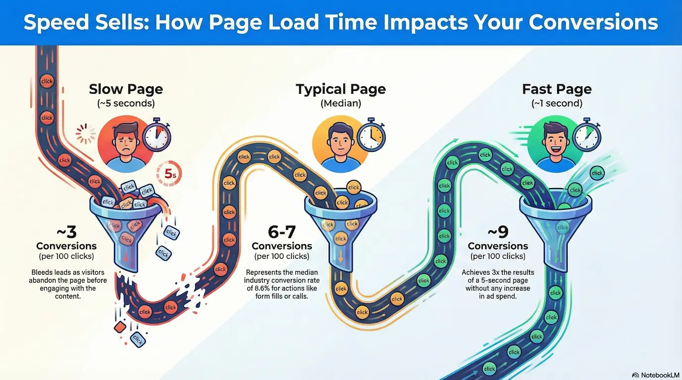 Slow page (~5 seconds) ~3 conversions (illustrative) Same traffic, same ad budget, but the page is bleeding leads because people abandon before engaging.